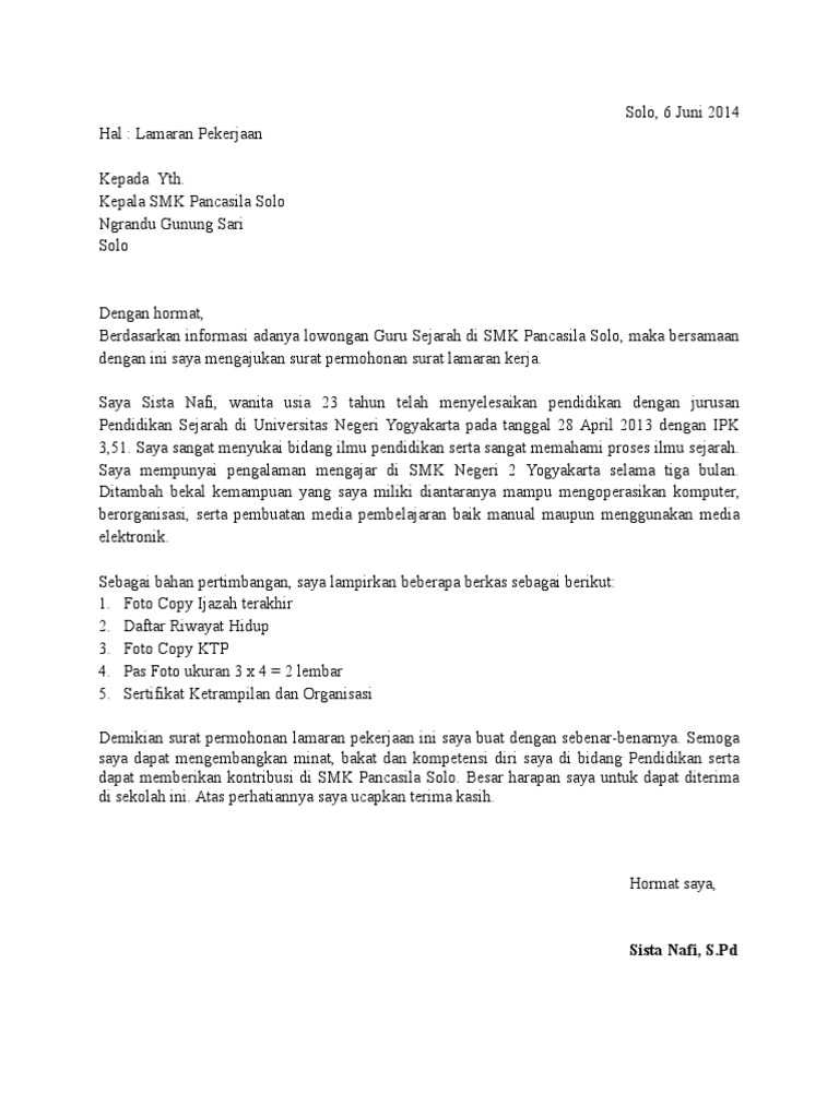 Lamaran pekerjaan yth, bapak/ibu kepala sekolah yayasan paud nurul fikri di demikian surat permohonan lamaran kerja ini saya buat, besar harapan saya agar kiranya bapak/ibu dapat menerima saya sebagai salah satu. Akan tetapi, karena tujuan tempat berikut adalah 5 contoh surat lamaran guru terlengkap yang bisa anda gunakan Peruntukan dokumen ini sebenarnya dikhususkan untuk pelamar cpns di kementrian pendidikan dan kebudayaan (kemdikbud) ri, namun tidak menutup kemungkinan dapat digunakan untuk. Berikut contoh surat lamaran kerja yang baik dan benar serta dapat djadikan referensi utama. Dapatkan file contoh surat lamaran doc yang tidak diproteksi pada situs www.contohsuratlengkap.xyzfull description.